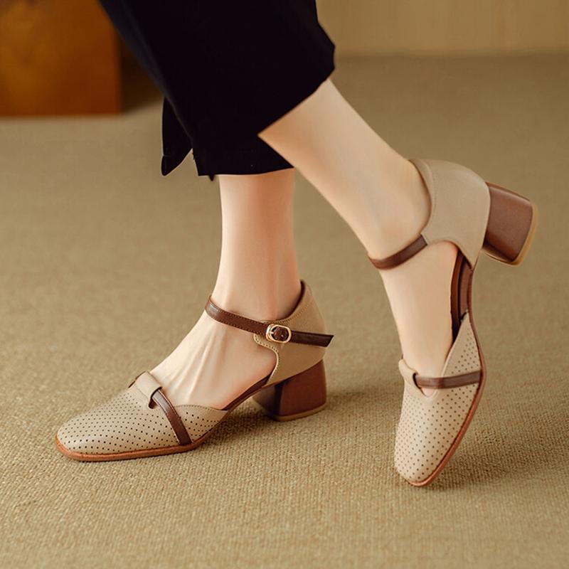 Fashion NEW Summer Women Sandals Split Leather Shoes for Women Square Toe Chunky Heel Shoes Plus Size Cover Toe Slingback Hollow Sandals