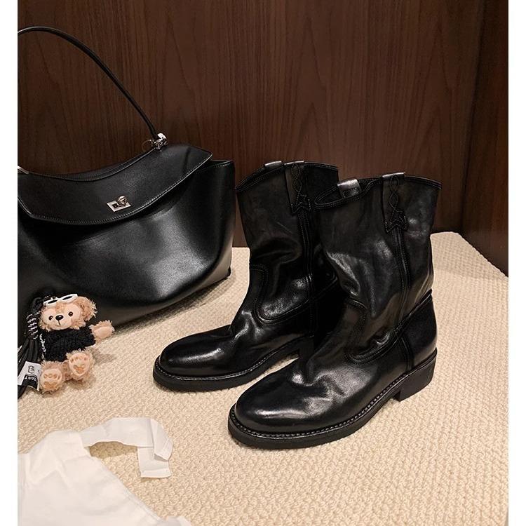 Washed cowhide~ grape mother leather retro V-mouth medium boots locomotive boots thick heel western cowboy boots women's short boots