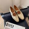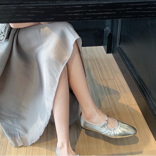 Cowhide version~ fairy style silver leather flat-soled single shoes women's pleated one-word buckle belt Mary Jane small leather shoes ladle shoes