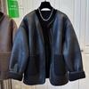 Leather And Fur Splicing Integrated Round Neck Jacket For Women In Autumn And Winter Loose Design Short Jacket