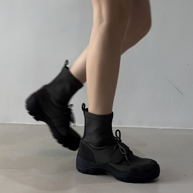 Cowhide version~ Functional wind sports thick-soled strap elastic socks boots Korean version elastic thin boots black short boots women