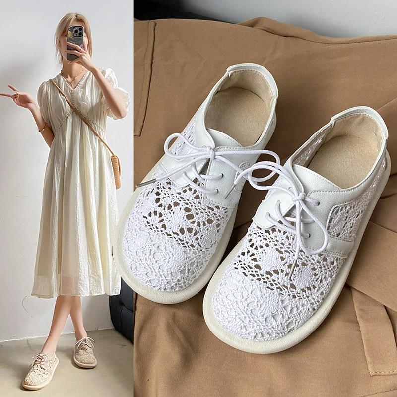Fashion 2025 Artistic Cotton Linen Lace Mesh Women's Shoes Summer Beach Shoes Bohemian Single Small White Shoes