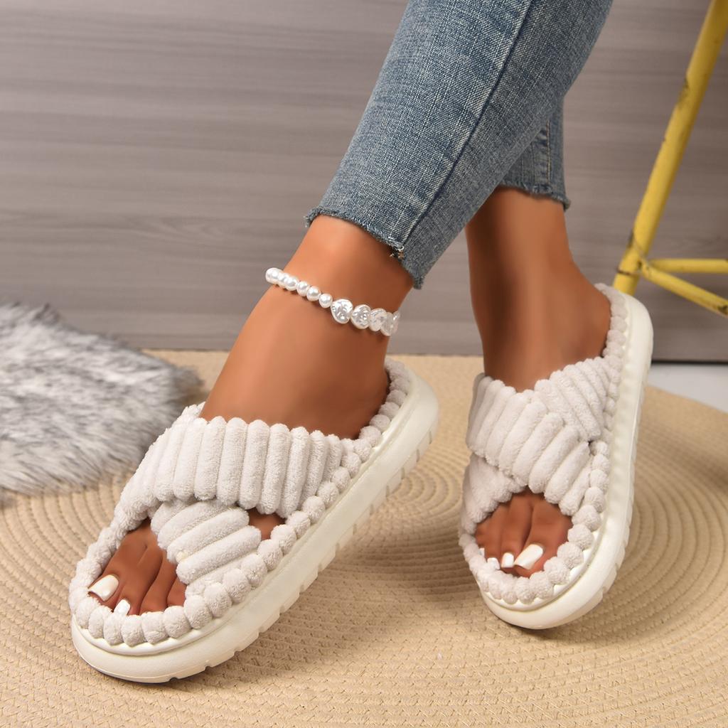 Fashion Women Corduroy Cross Strap Home Slippers Men Soft Warm Flat Slides Family Indoor Fashion Concise Plush Sandals for Four Seasons