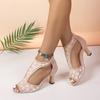 Outer size large size European and American style fish mouth printed sandals summer new middle heel fashion women's shoes tea
