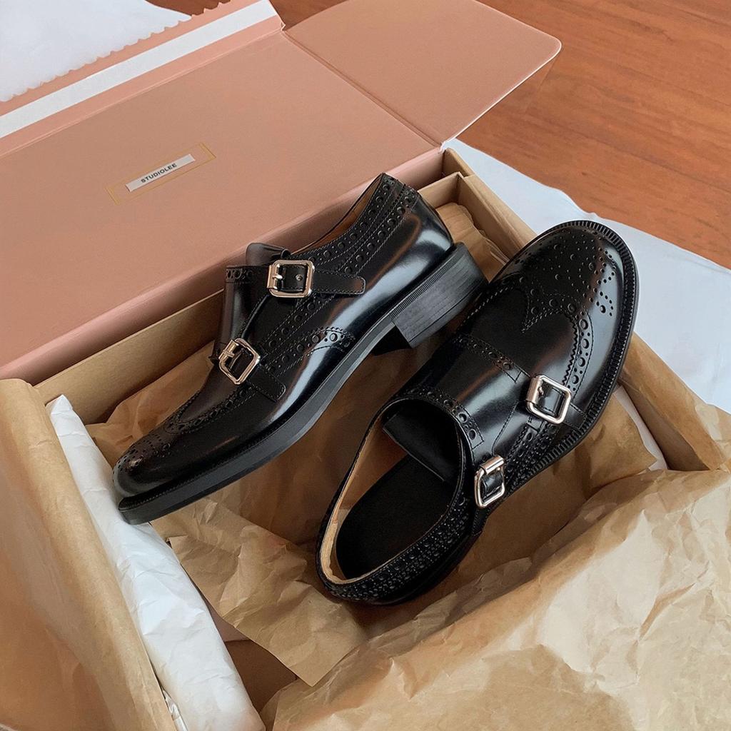 Cowhide version~ Temperament French leather engraved loafers women's spring and autumn thick-soled small leather shoes thick heel single shoes