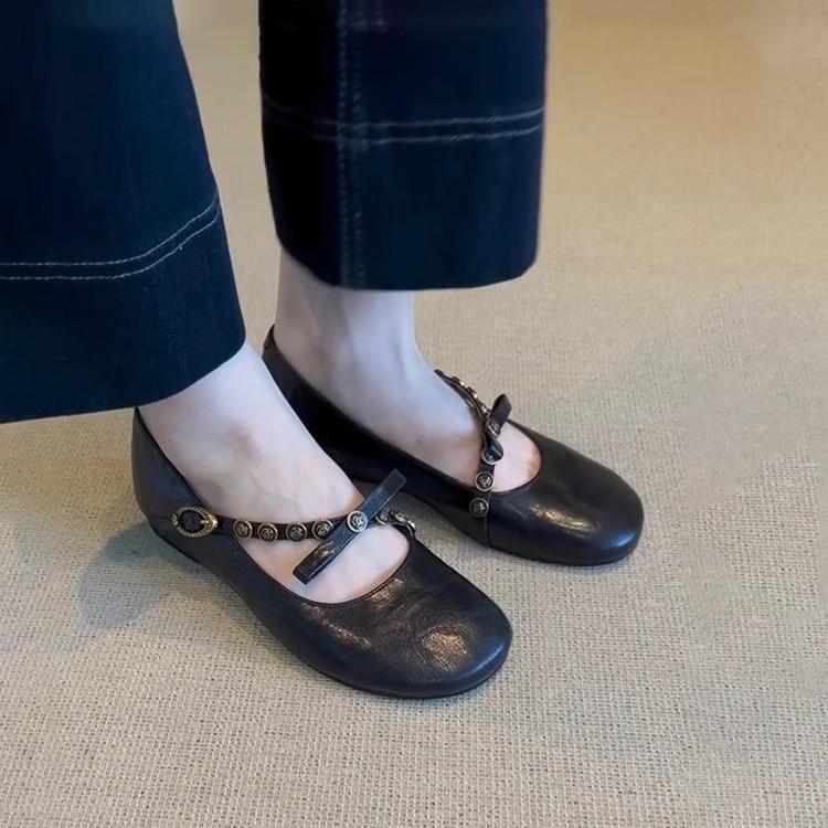 Sheepskin version~ French retro shallow mouth one-word buckle bow single shoes flat leather one-pedal Mary Jane shoes women