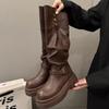 Fashion Knee High Boots Women Autumn Casual Slip on Women Shoes Square Mid Heels Solid Leather Circle Buckle Motorcycle Boots