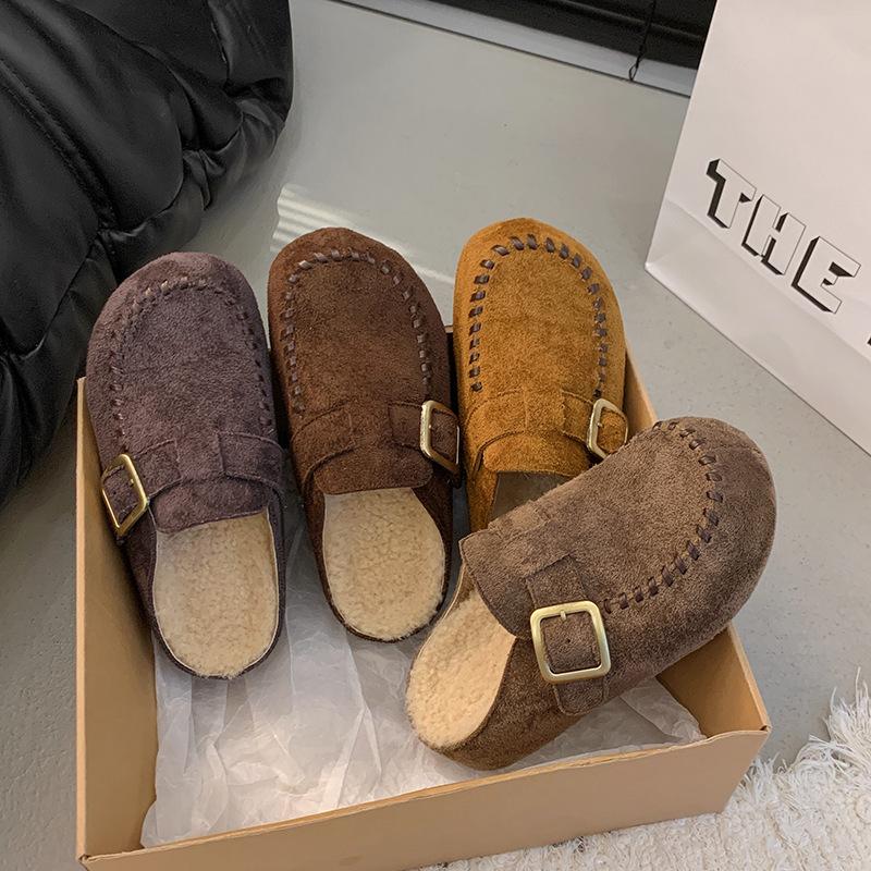 Fleece half slippers women's outer wear 2025 autumn and winter new models are not tired, the feet are huge and the good-looking one-pedal thick-soled