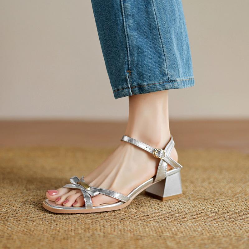 New women's one-word sandals casual high-heeled sandals women's summer soft-soled size women's shoes mid-heel square head back empty