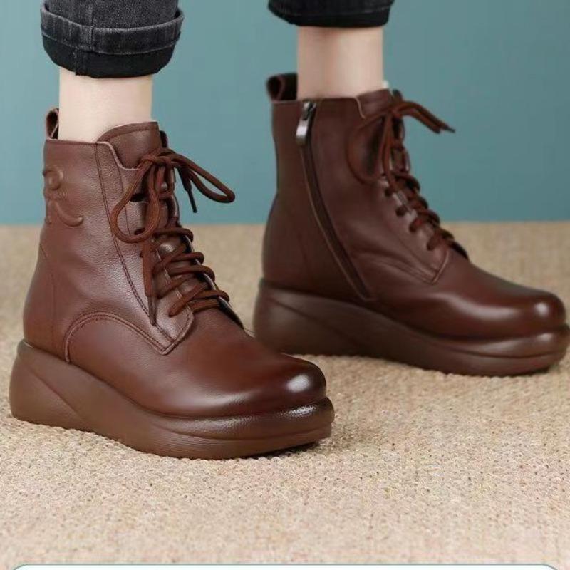 Soft leather boots women's thick-soled muffin shoes slope heel round head autumn and winter new real soft leather velvet thickened warm fashion boots
