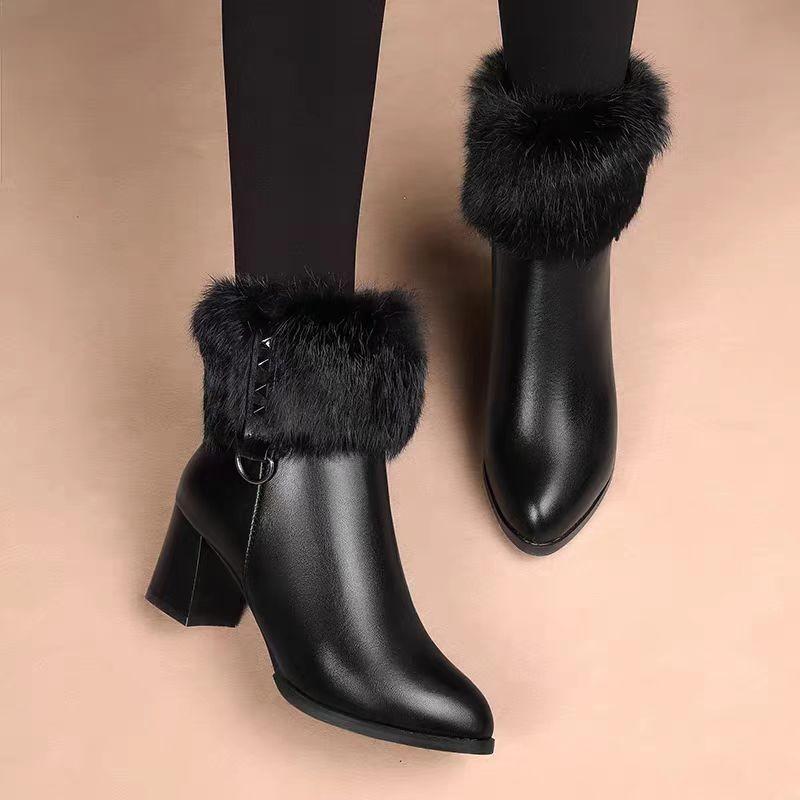 Soft leather velvet boots women's winter versatile mid-heel fashion boots women's square heel mid-heel boots velvet cotton shoes large size 4