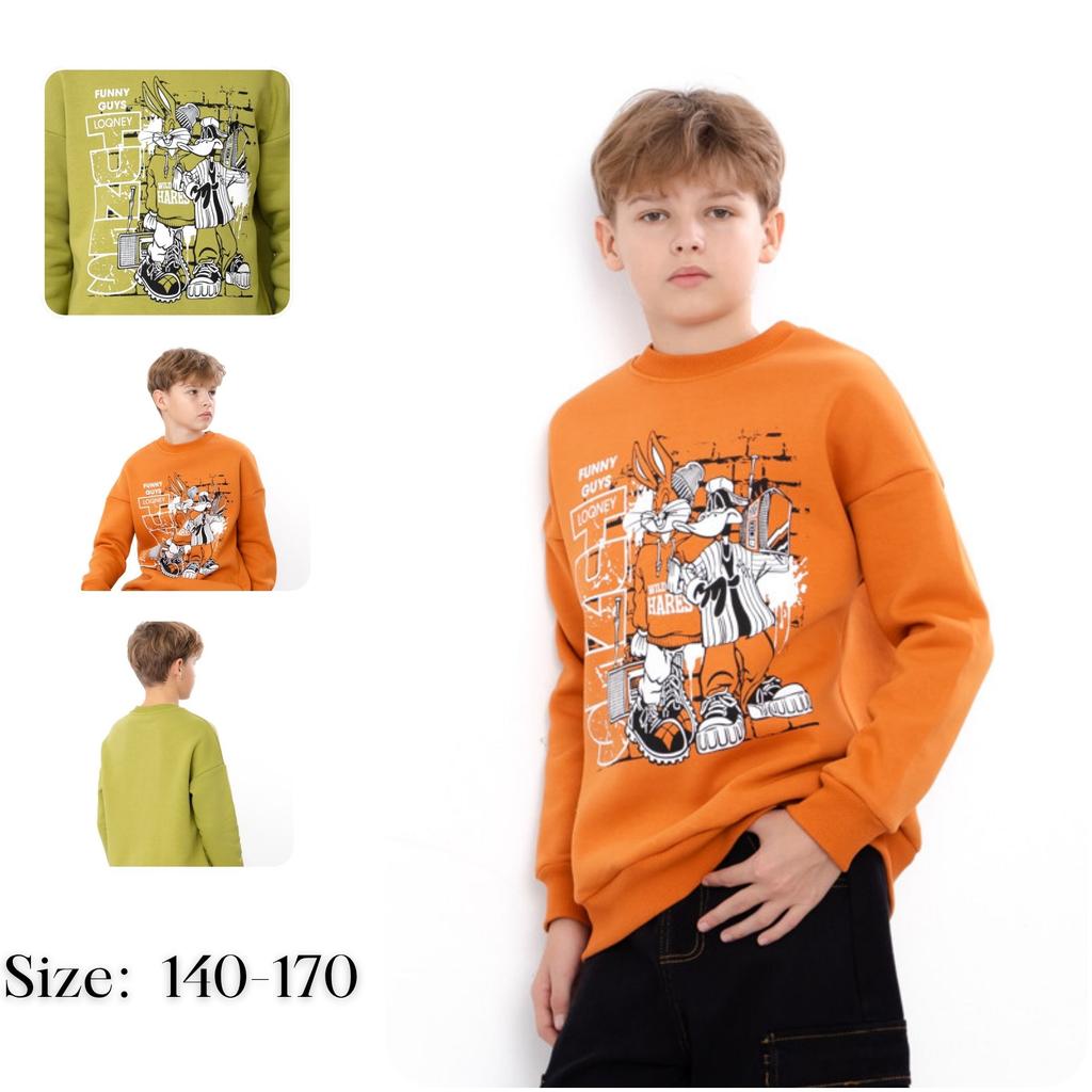 This warm oversized boys’ sweatshirt with a print is one of the most comfortable clothing options for the cooler season. It combines softness, warmth, and practicality. The solid three-thread knit fabric is dense, soft, and retains heat well. Fabric composition: 80% cotton, 20% polyester. The oversized cut allows freedom of movement, letting children play comfortably. Elastic cuffs and a neatly finished neckline ensure a perfect fit. A modern character print adds individuality to the look. This sweatshirt is a versatile choice for school, walks, or trips.