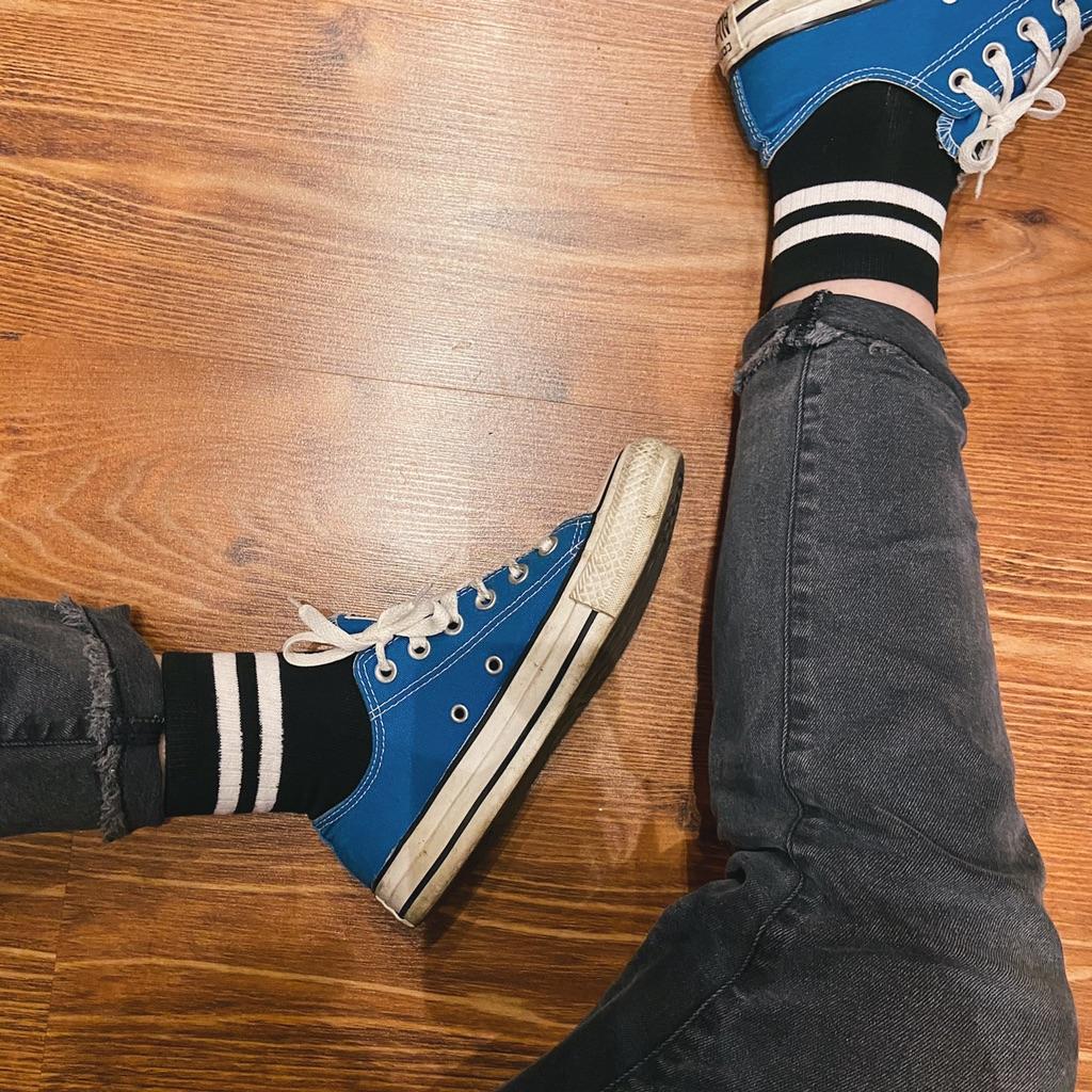 Leuke sportieve sokken! Het materiaal is een beetje dun, maar het maakt niet uit Ik vind witte streepjes aardig! Sokken passen goed bij sneakers en andere sportieve schoenen Ze zien er stijlvol uit ✨💙🖤🤍 Ze waren samen met drie andere bestedingen in één pakket geleverd, makkelijk om te halen Vijf sterren dus!