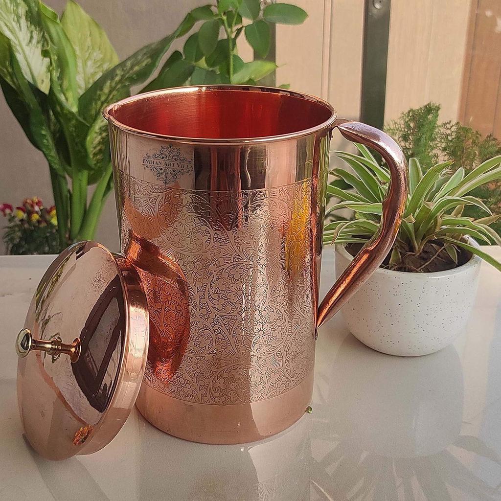 Full Embossed Design Copper Jug Pitcher with Brass Knob, Storage & Serving Water, Yoga Ayurveda Healing, Volume- 2000 ML