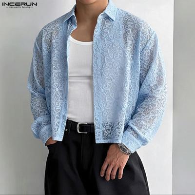 INCERUN Oversized Men Collarless 3/4 Sleeve Flowers Texture Casual Tunic Tops Shirts