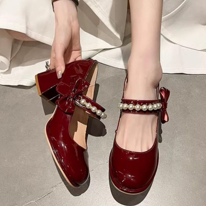 Mode 2025 Nieuwe Luxe Platform Kralen Strik Bruiloft Dating Schoenen Lente Dames Mary Janes Pumps Ronde Neus Blokhakken