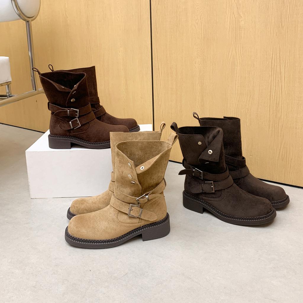 Height increase 5.5cm~ Maillard thick heel thick bottom buckle with cow suede high heel short boots 2025 women's autumn Martin boots