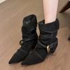 Vintage Maillard! Temperament suède puntige metalen gesp opgestapelde laarzen dames 2025 herfst en winter geweven two-wear korte laarzen