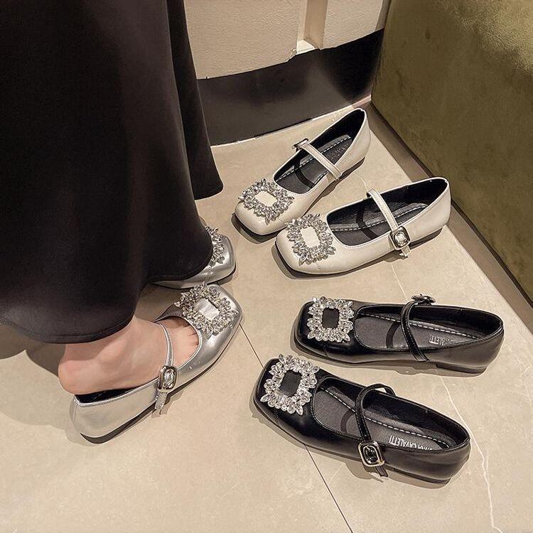 Flat-bottomed French versatile shallow-mouth single shoes women's spring and summer 2025 new one-word with rhinestone square head Mary Jane shoes