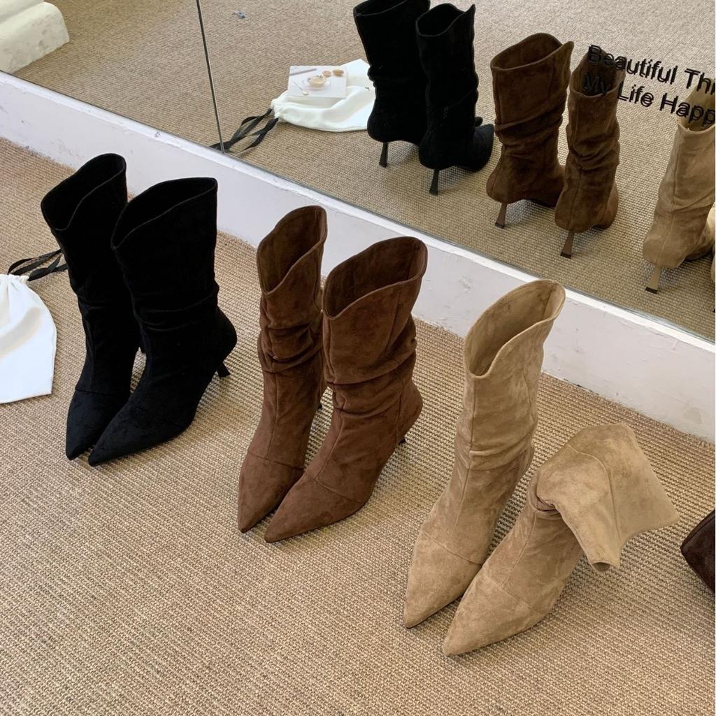 2025 nieuwe herfst suède puntige hoge hak dunne medium schacht mode Martin medium schacht dames korte laarzen