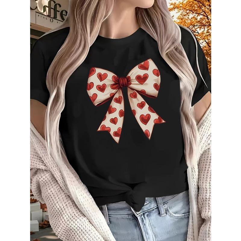 Europese Maat Losvallend T-shirt voor Dames met een Rood Hart en Strik Ontwerp - Zachte Ronde Hals, Casual Kleding, Biedt Comfort voor Alle Seizoenen