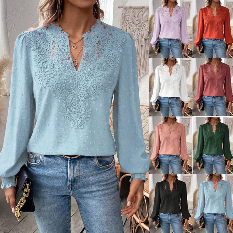 2026 Europe Autumn/Winter V-neck Lace Solid Color Long Sleeve Casual Women's Top