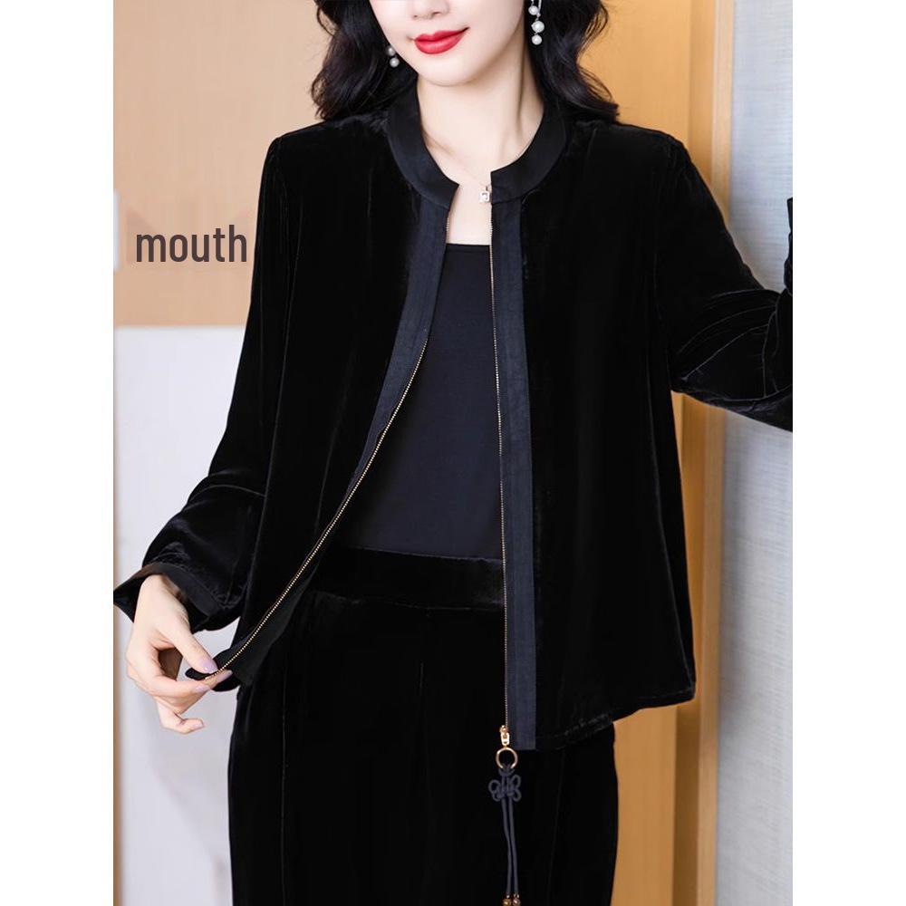 2025 Autumn/Winter Retro Gold Velvet Cardigan Jacket for Women: Stylish National Round Neck Short Top