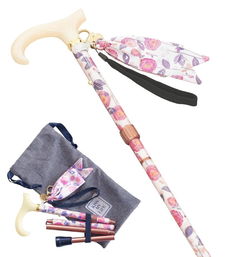 Folding Walking for Misuzu Uta x KISS MY LIFE with Kaneko Embroidered Pouch Stick, Lightweight, Women, Collaboration, Misuzu's "Camellia" (Akane)