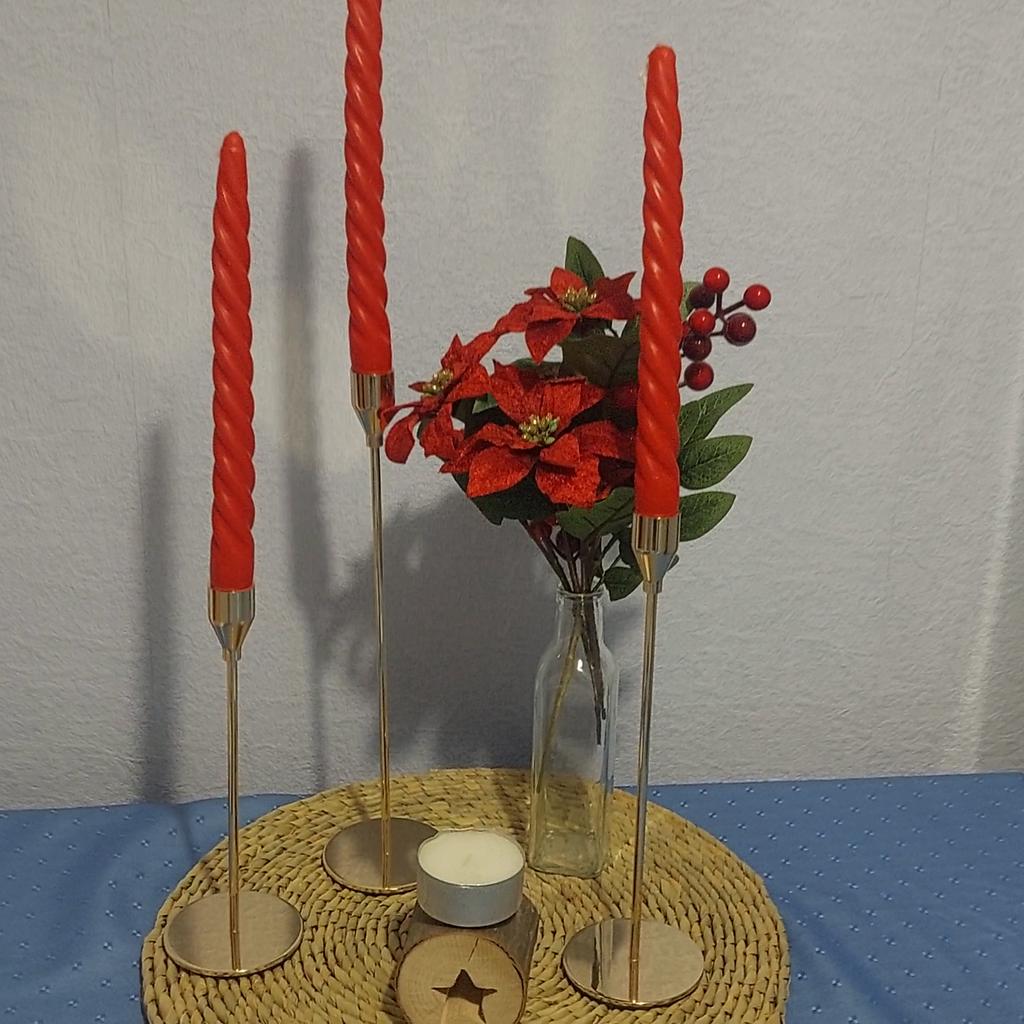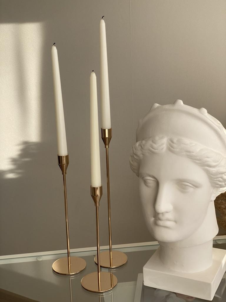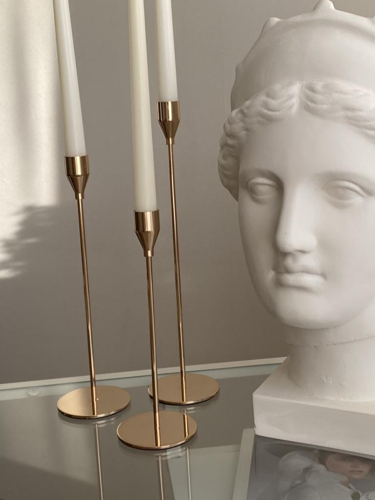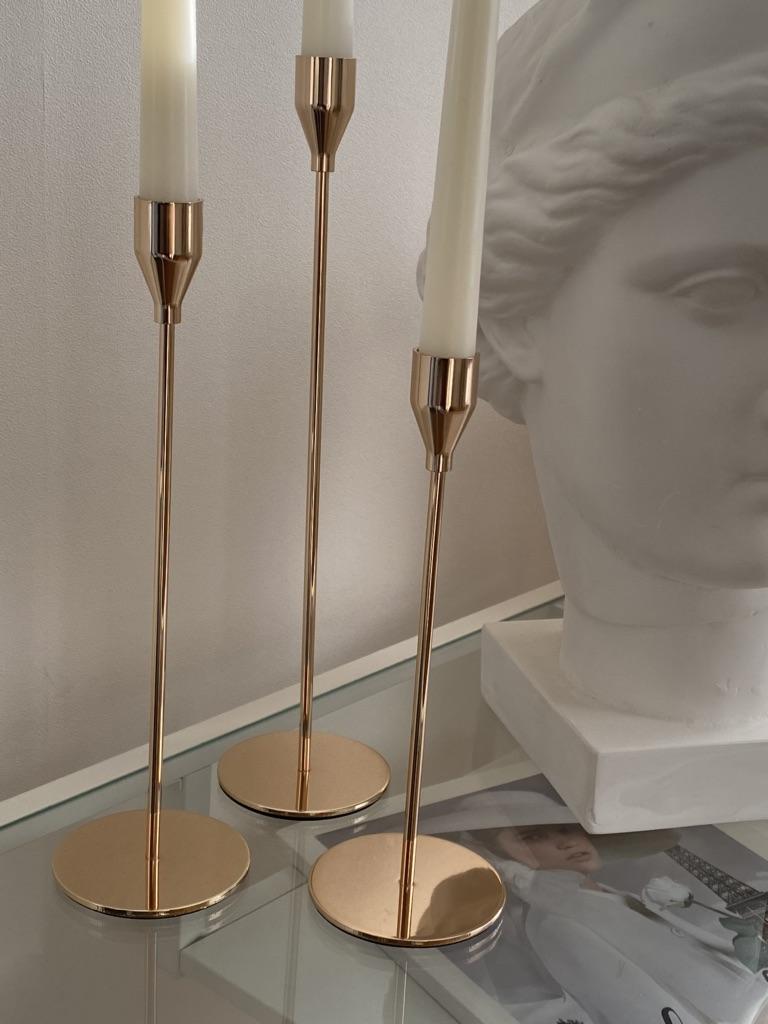 ООО!!! Это стон моей души! ЗОЛОТЫЕ подсвечники! ТРИ! Изящные! Прочные! Тяжёлые. Дно подставки с защитой. Царапин не будет. Нууу! Вот ОЧЕНЬ красивые! Обязательно закажу ещё два таких комплекта в подарок. Меня порадовал Джум! Я принесу радость и живой огонь в дом любимым людям! Спасибо, всем творцам и продавцам, такой прекрасной троицы!
