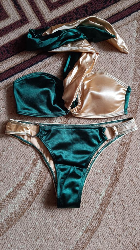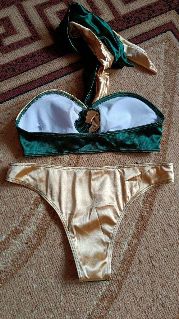 Купальник красивый, по качеству пошит хорошо, никаких торчащих ниток и запаха нет. Размер подошёл, верх отлично, а вот трусы немного сзади на попе передавливают, так как ткань тянется плохо(