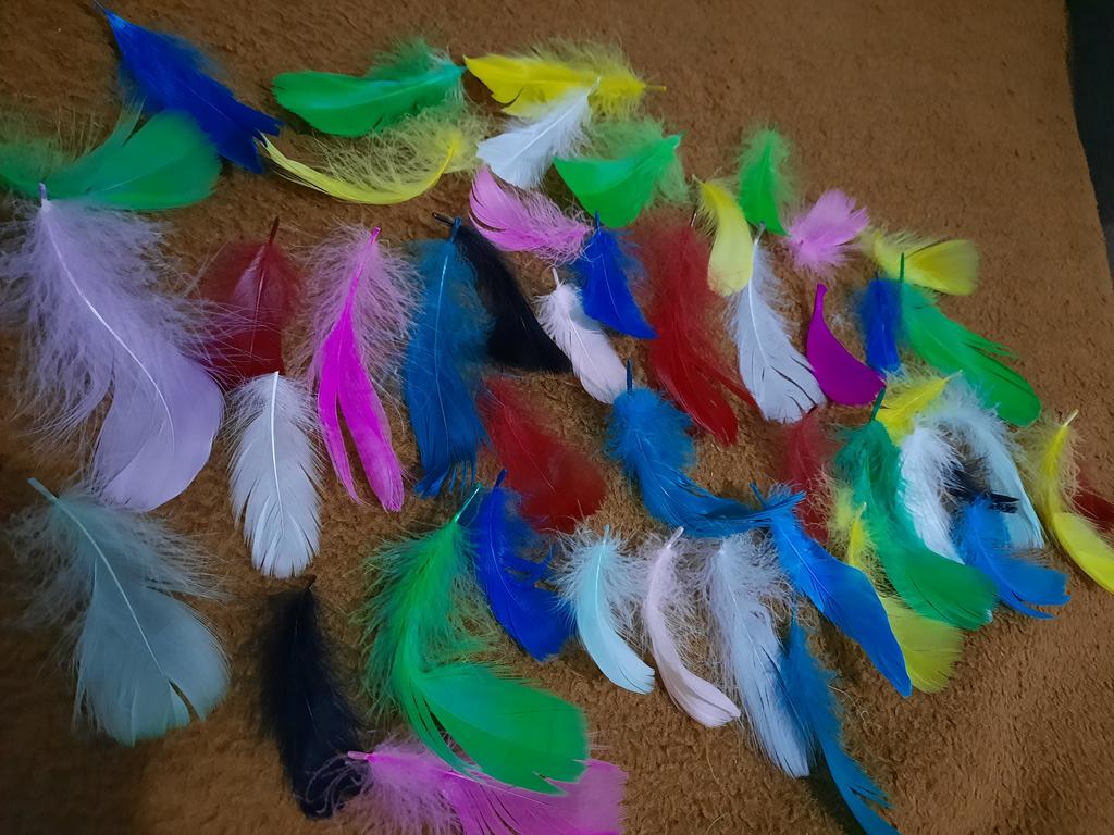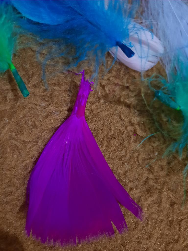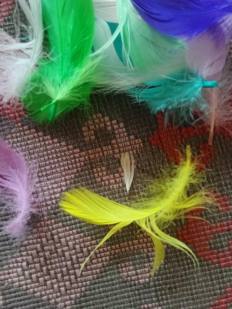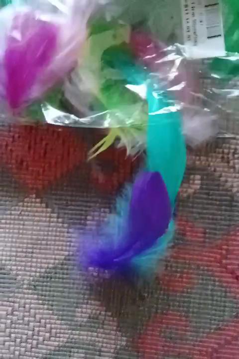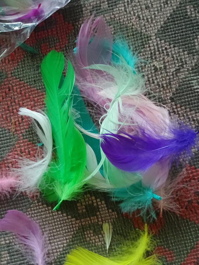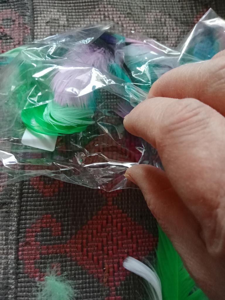 Упаковка повреждена, перышки рассыпаны по другому пакету. Они какие-то все мятые и разные, как будто из старой перины надергали и покрасили.