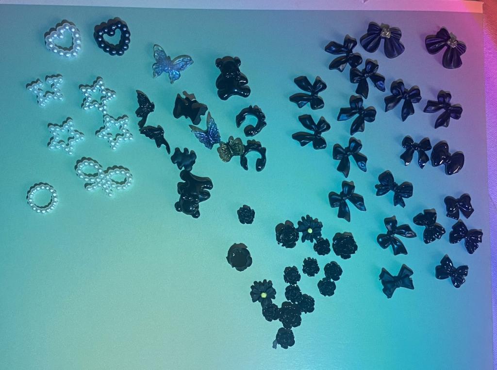 1 белое сердце 1 чорное сердце 3 звезды 1 бант 1 колечко 1 большая полу голубая бабочка 2 маленьких бабочки (зелёная и синяя) 2 чёрных крыла 2 больших медведя 1 маленький матовый медведь 1 чёрная бабочка 2 пары наушников Дофига роз 2 ромашки 10 матовых бантиков 2 больших бантика 6 маленьких бантиков (Оценка 4 за то что 1 звезда пришла поломана)
