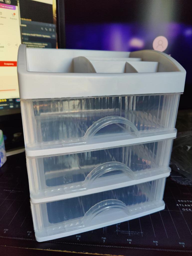 На фото пластик выдвижных ящиков прозрачный, и я такой пластик знаю, он совершенно другой. У меня из такого есть органайзеры в шкафу, хотела к ним в комплект этот комодик. А приехала полная ерунда, на фото похожа только форм-фактором. Выдвижные ящики из мутного мягкого дешевого пластика, их даже трогать неприятно. В целом за такие деньги и сойдет может быть, но оно мне точно не надо, в такое духи дорогие складывать - духи не уважать. Отдам на благотворительность. Жалею, что купила.