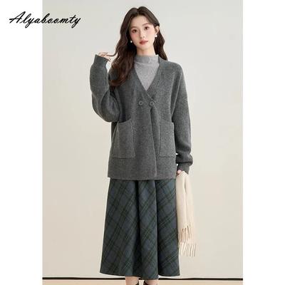 2025 Весна Осень Женский Стильный Вязаный Кардиган V-образный Вырез Бежевый Серый Хаки Мешковатый Свитер Корейская Мода Уличная Женская Базовая Вязаная Верхняя Одежда