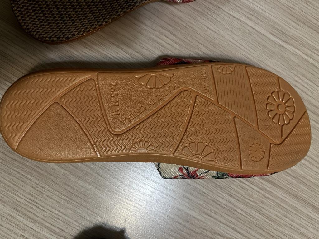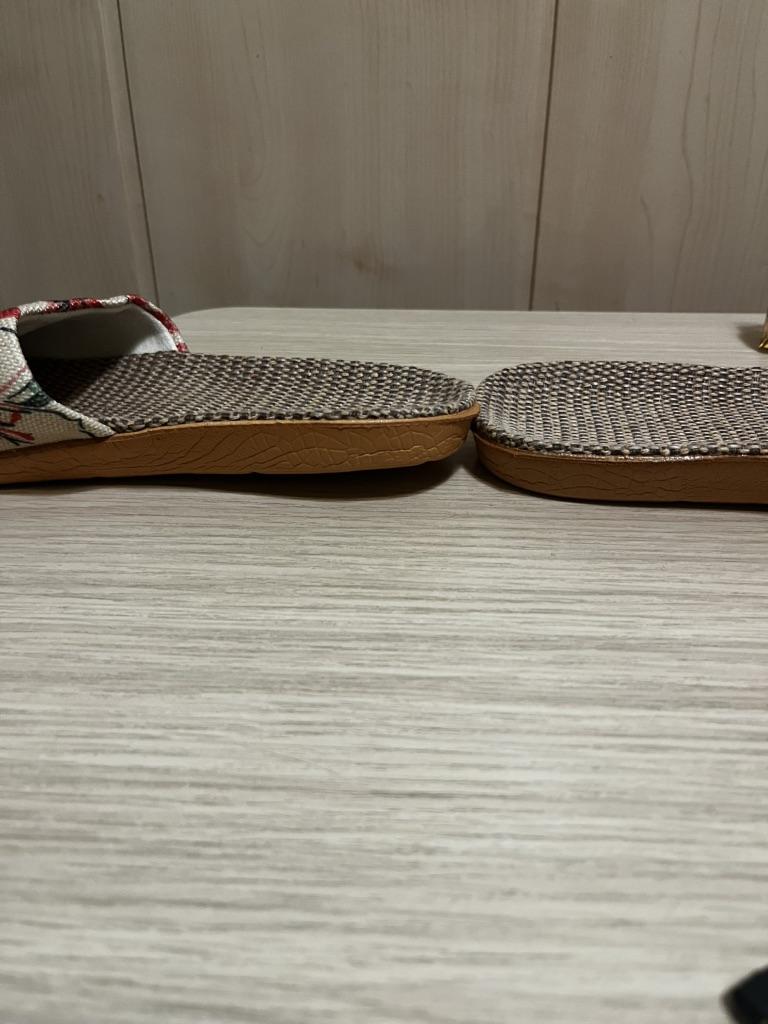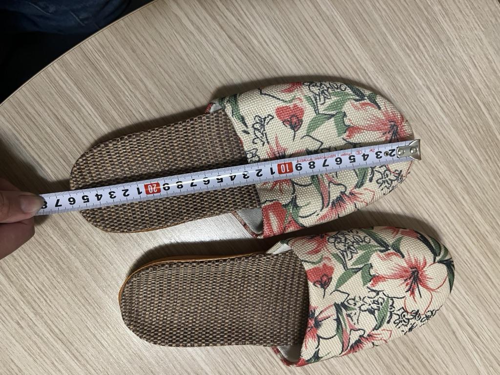 Пришли тапочки на пенопластовой проминающейся подошве!!! Один тапок кривой, пятка провалена до дна и завалена на бок, будто сношена. Ткань тапочка - синтетика, а внутренняя подкладка- это вообще какая-то клеенка, не дышит абсолютно, поэтому нога сразу начинает мокнуть в тапочке, хотя в карточке товара заявлен ДЫШАЩИЙ лён. Ужасный товар. Не рекомендую.