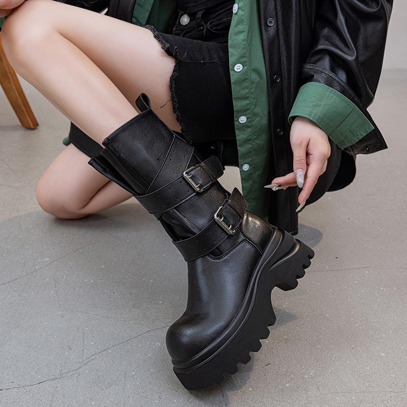 Ретро ботинки-рыцари средней длины на толстой подошве, женские новые короткие ботинки с пряжкой-ремнем осень-зима 2025, однотонный дизайн