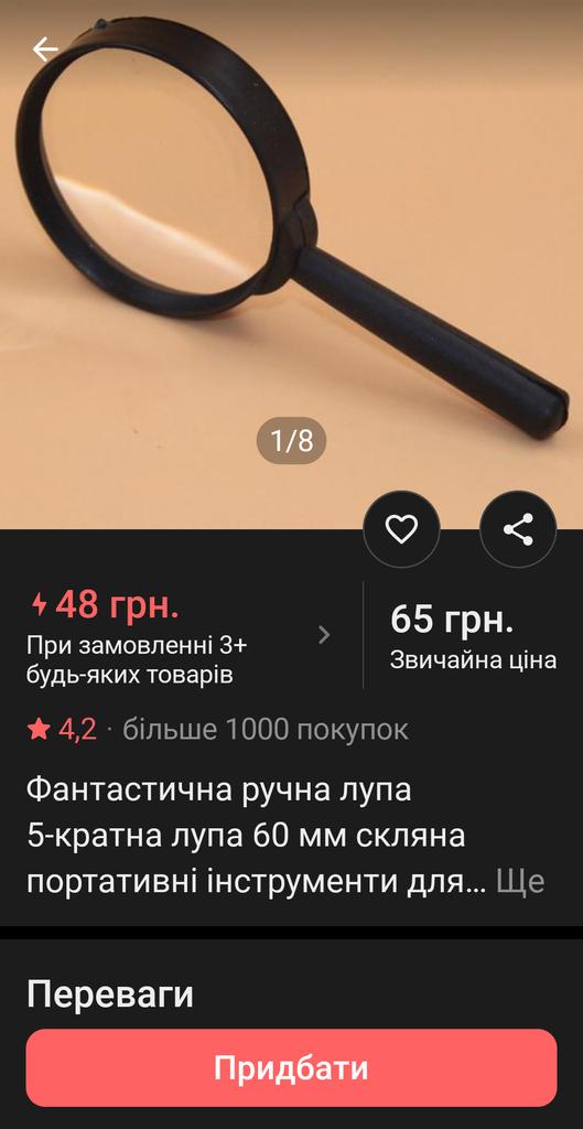 Дешева рибка - погана юшка! Я такої поганої лупи ще не бачив. Замість того щоб бути випуклою з обох сторін лінзою - в геометричній середині лінзи навпаки ввігнутість 〗〖. Одним словом - лупа збільшує все лише в діаметрі 0.5 сантиметра - все інше буде сильно розмитим. Я звісно ж і очікував що за 35 грн. нормального товару не отримаю, але щоб настільки поганим буде товар навіть і здогадатися не міг. Тим більше, що в ліпі замість стекла використали пластмасу!