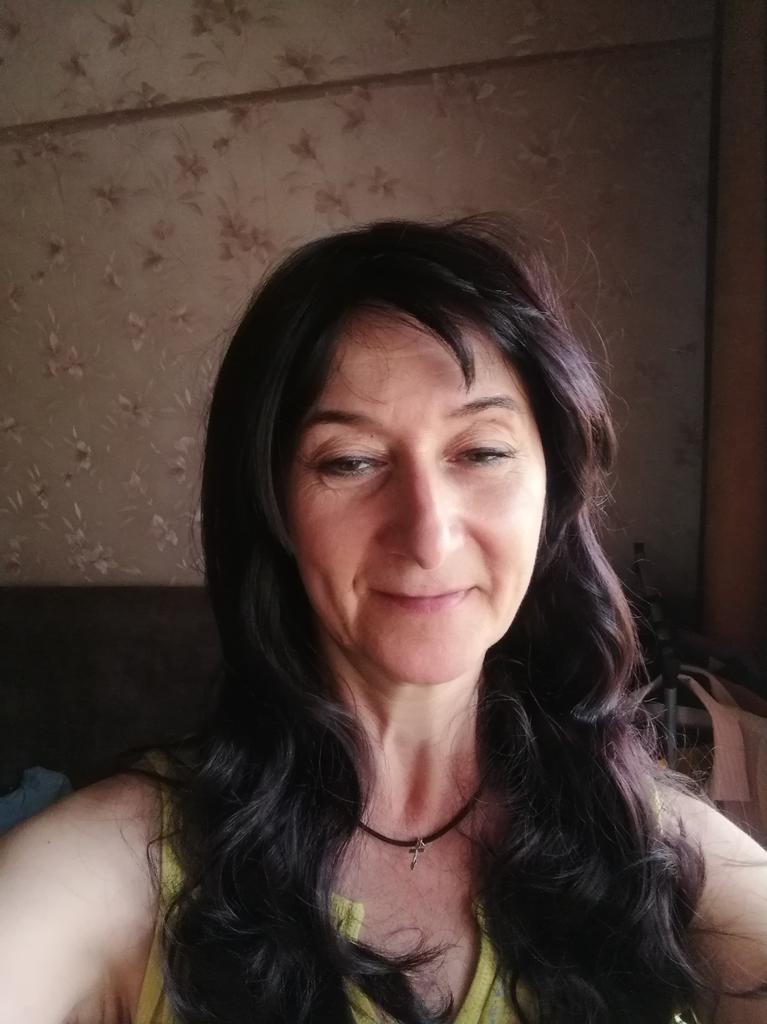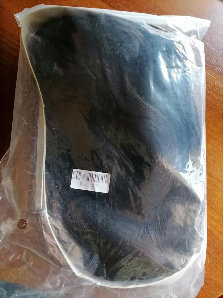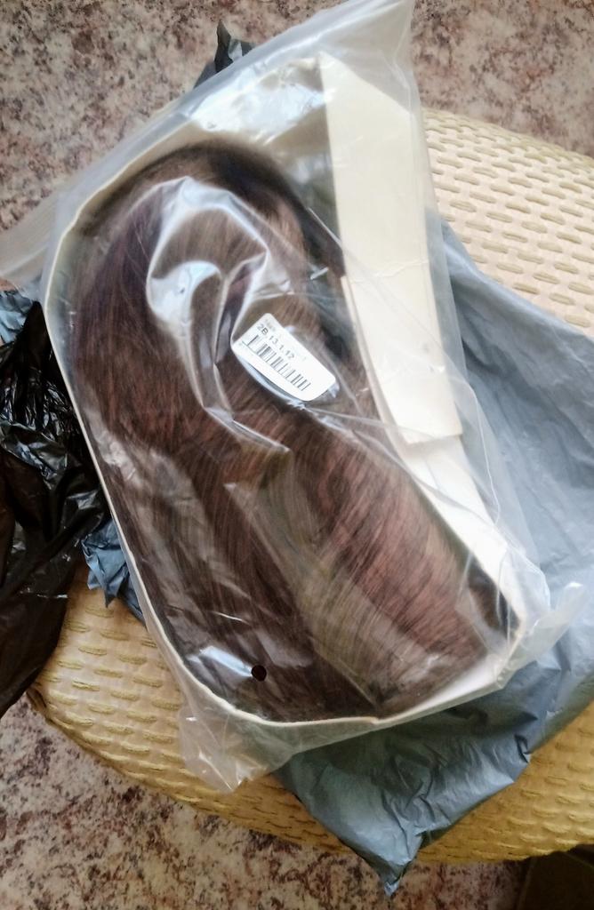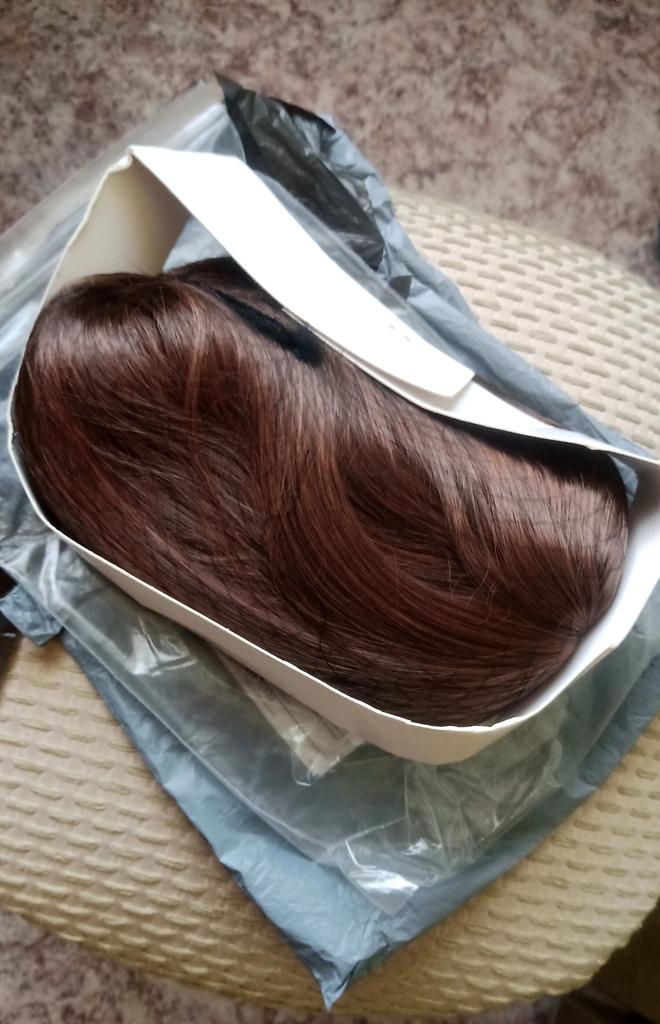 Gorgeous wig! The color is reddish-brown, slightly shiny. It lies in a mesh and in a zip bag, around the bag there is a tape made of thick cardboard, but crumpled on the road.. The bangs are long, but I won’t cut them off - everything is in the same style. Reasonable price I definitely recommend it.