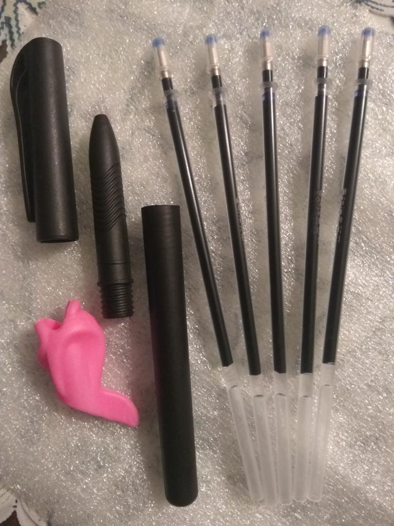 5 зарядів, сама ручка і насадка на ручку жовтий гумовий дельфінчик. Чорнило через 30 сек вже немає. Хотілося б хоч 3 хвилини