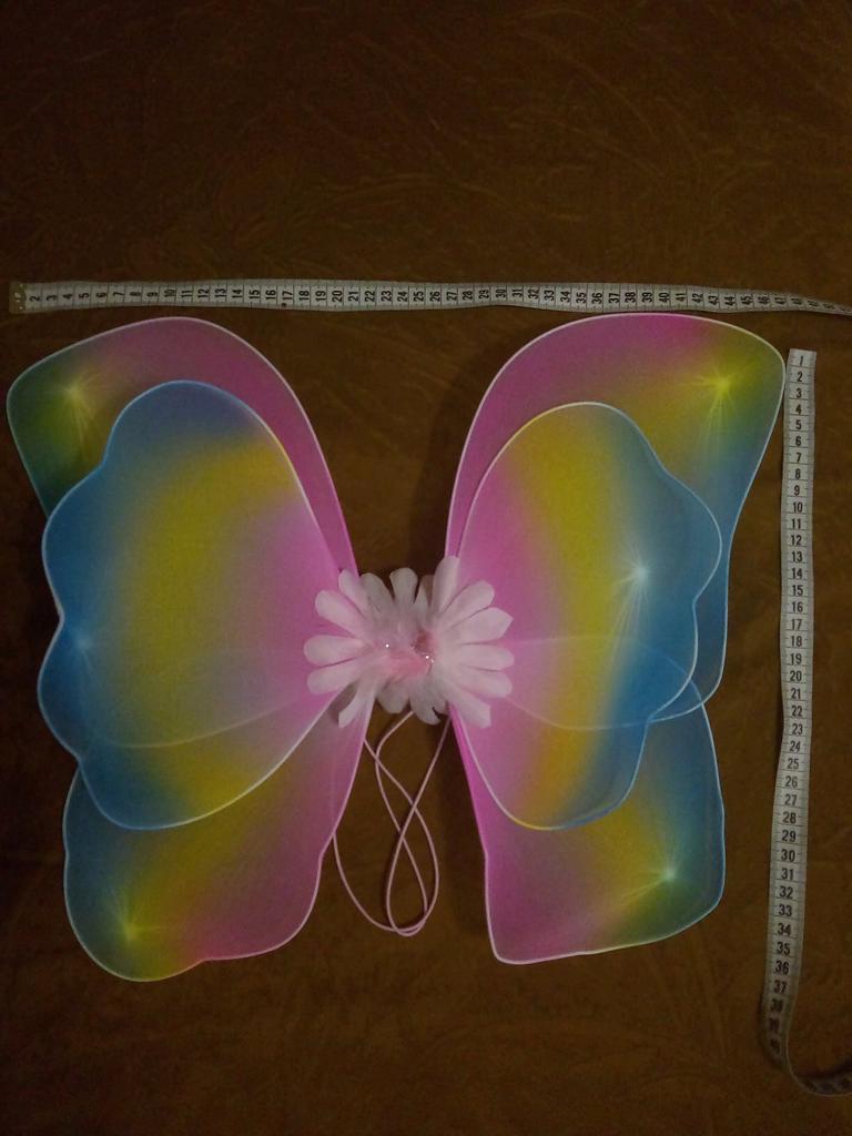 Містить градієнтні райдужні двошарові крила метелика + стрічка казкова паличка + весняний обруч для волосся метелика + плісе спідниця-туту.