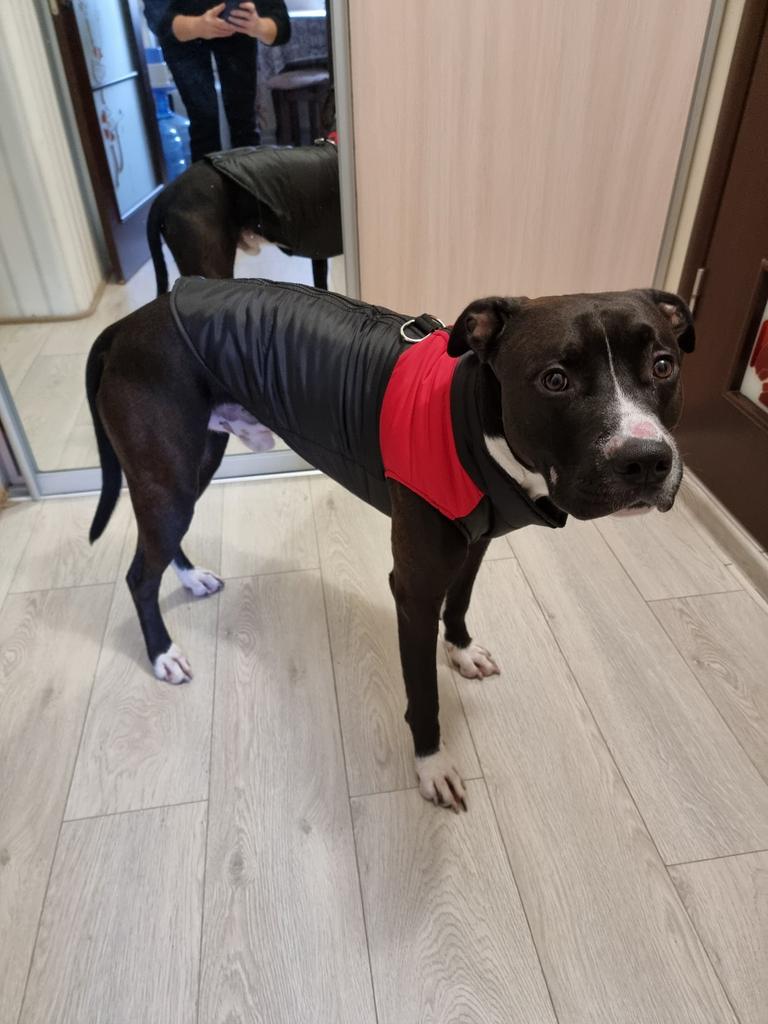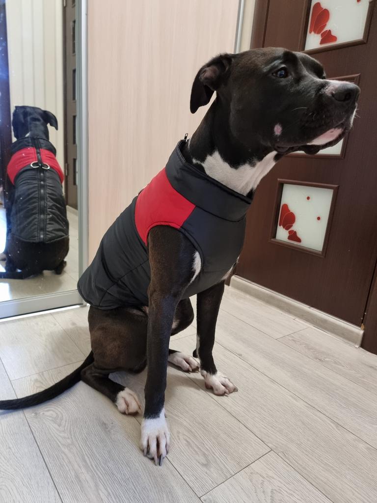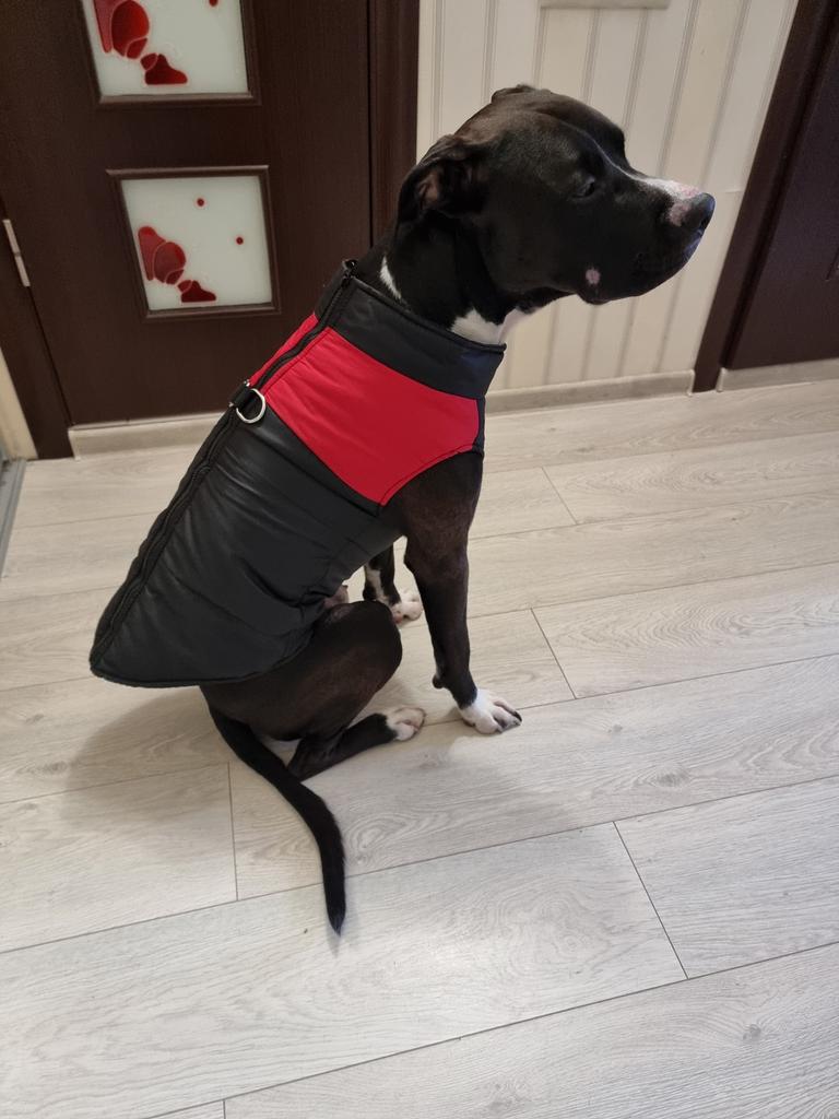 Замовляла на піт-буля, вага 29 кг. В притик!! Краще б брала 5xl. Але носити будемо. Якість нормальна, без недолік. Не дуже теплий. Як осіння куртка. На дощову погоду норм. На жаль, жопку зовсім не прикриває.