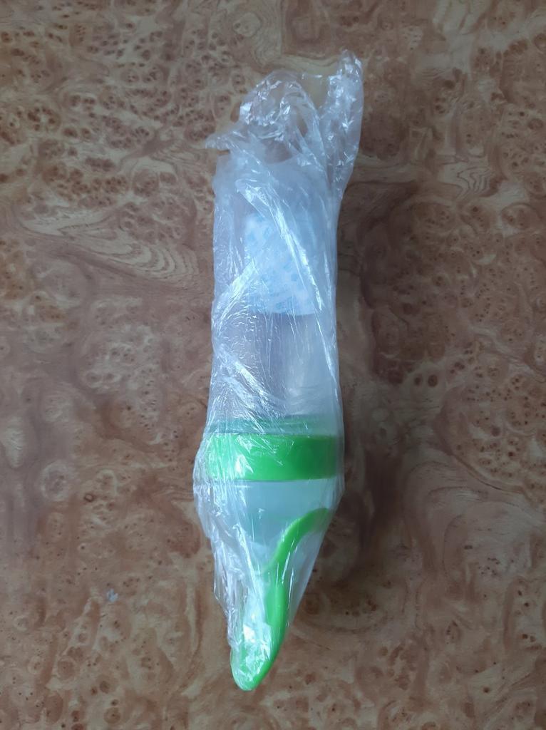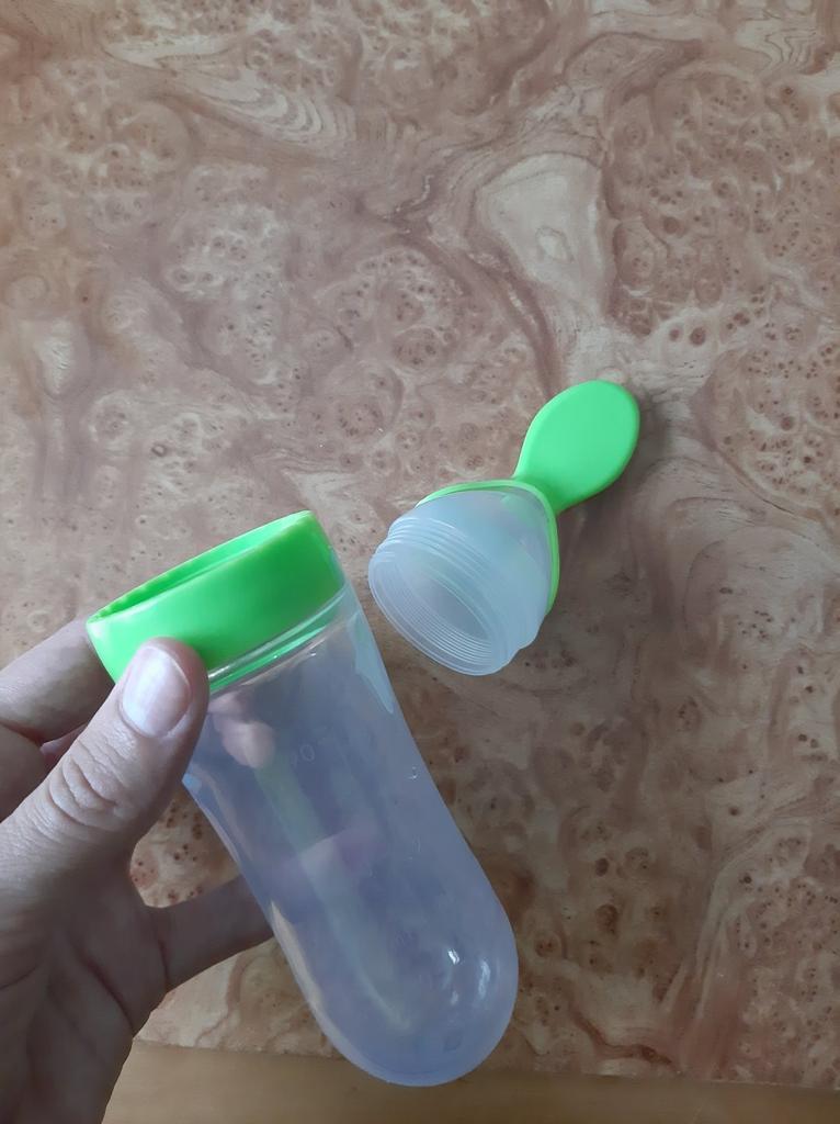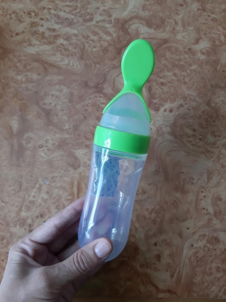 Посилка прийшла за три тижні. Бутилочка м'якенька, що дозволяє легко натискати на неї, але при цьому рідина самовільно не витікає. На стінці бутилочки є позначки (об'єм) - вміщає 90-100 мілілітрів. Сама бутилочка має запах резини, ложечка і кришечка без сторонніх запахів. Товар без дефектів. Продавця рекомендую. Колір бутилочки такий, як на сайті.