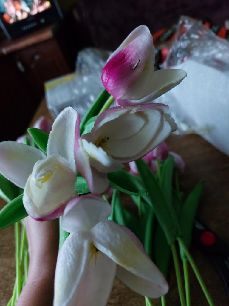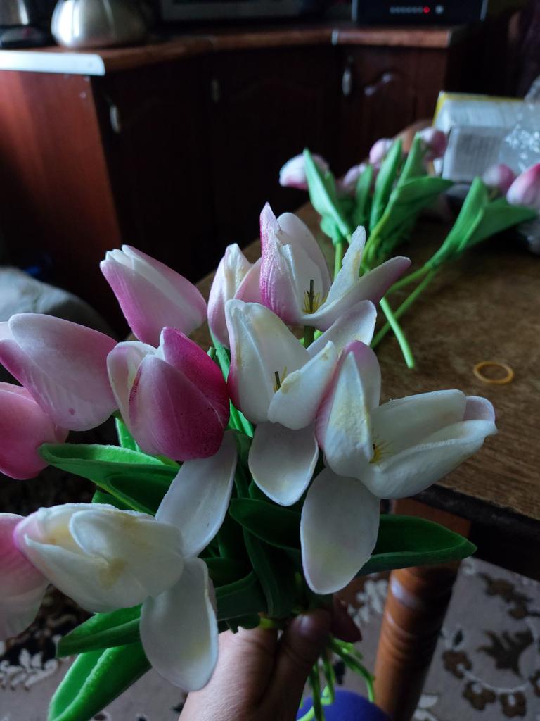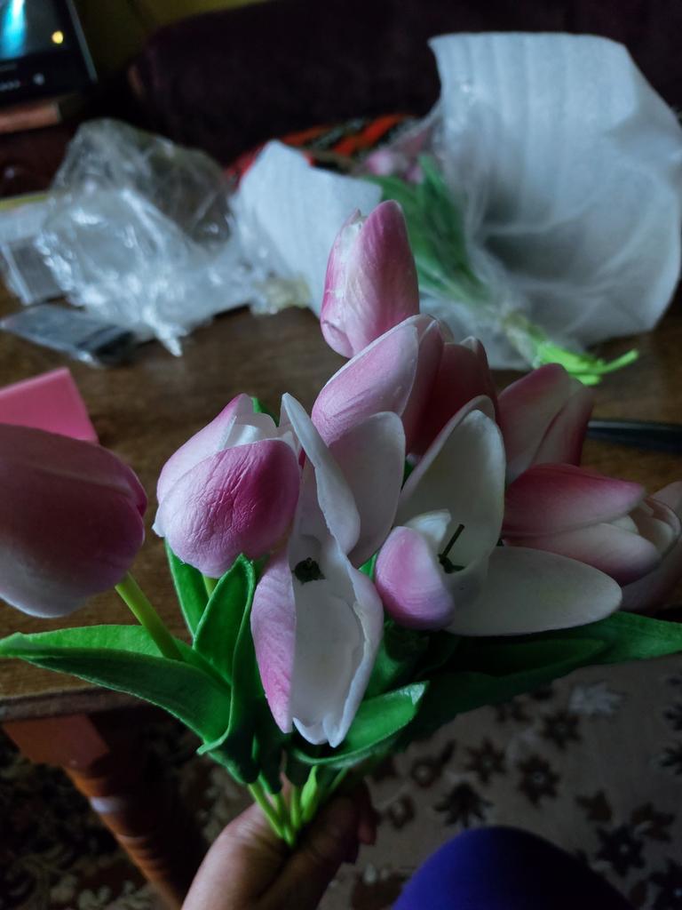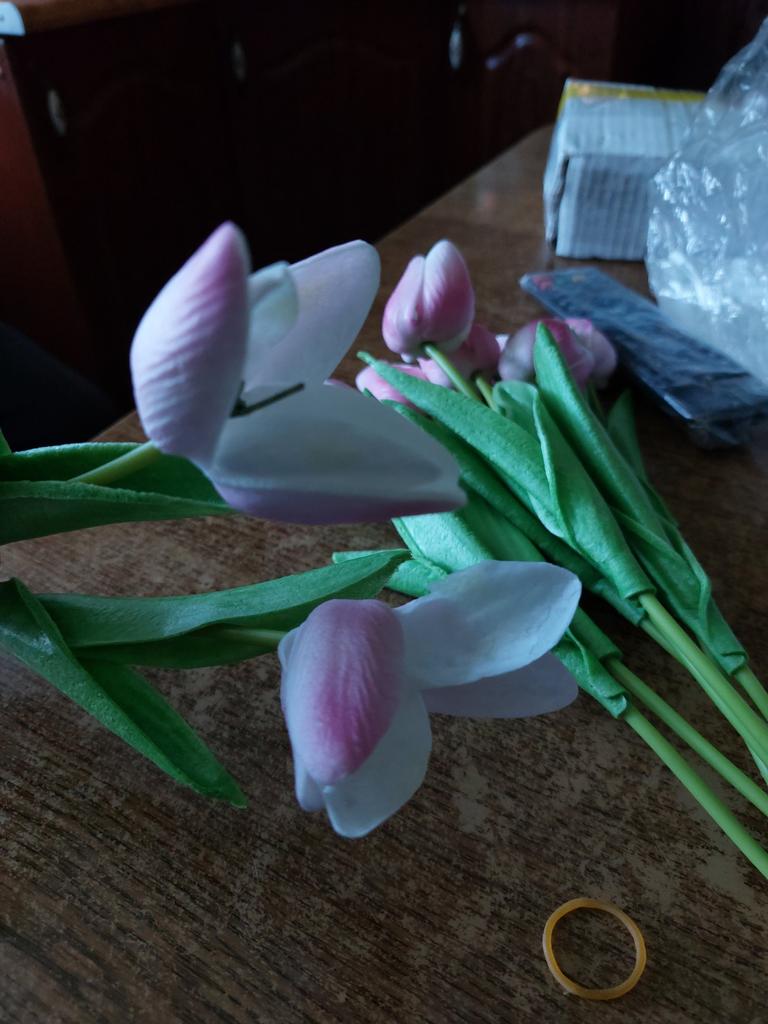 Замовила 20 штук, з них половина брачні. Неякісний клей, жовтого кольору, не якісна робота. Самі тюльпани дуже малі і щей до всього не той колір, який я замовляла. Мені не сподобались.