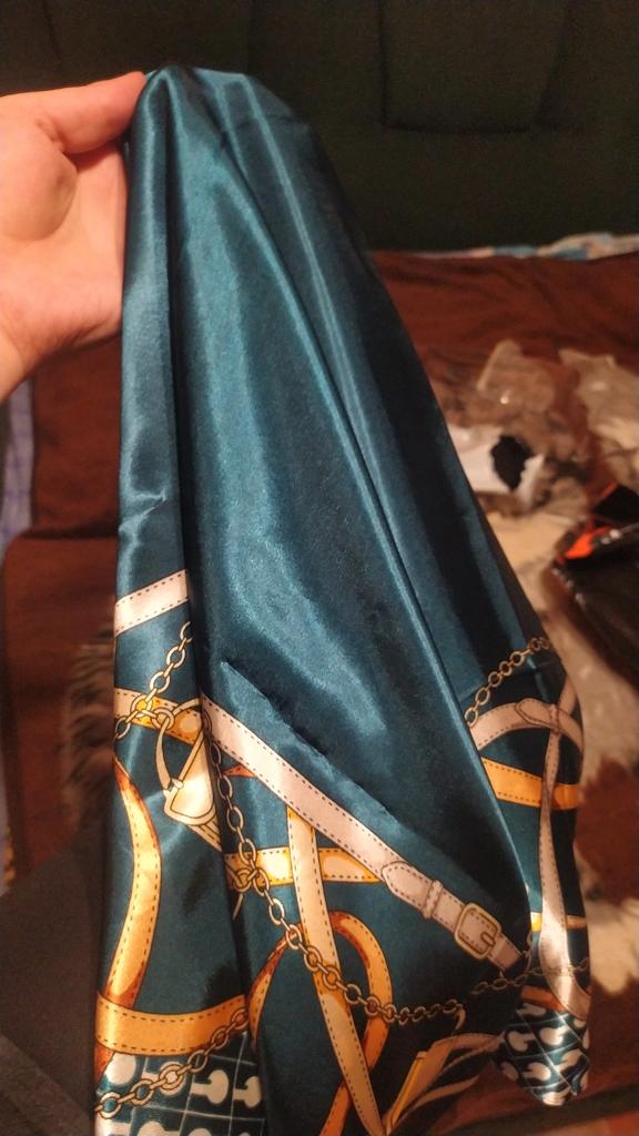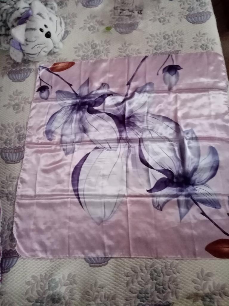 Гарна хустина, квадратна, 86 см діаметр, не шовк, але гарна розцвітка з блиском. На весну саме те, що треба. Дякую Джум. Рекомендую.
