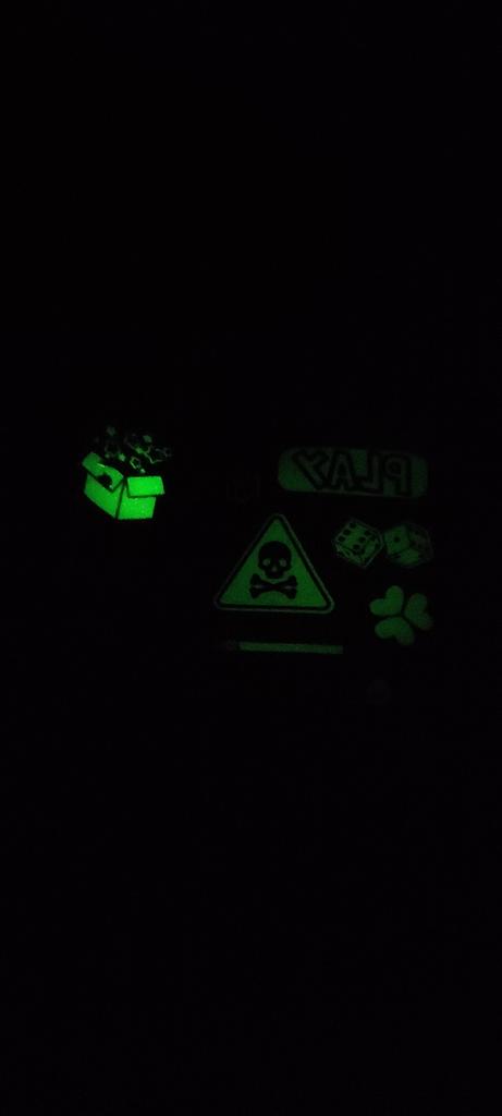 В темноті світиться, якщо потримати під світлом, одна половина зеленим світиться, інша фіолетовим. Зелені легко заряджаються від звичайного світло, фіолетові лише від ультрафіолету.