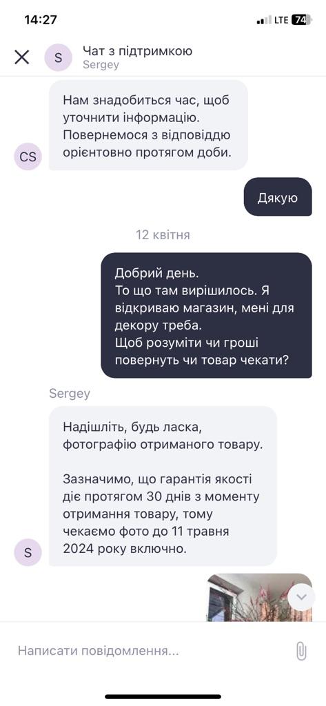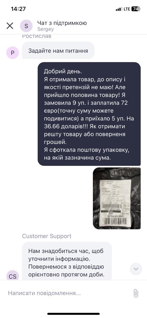 Жахливий продавець і підтримка від joom. Мені прийшов товар в половину менше! На 36 доларів. Я зняла пакування, з ціною і кількістю упаковок. А вони кажуть, що не можуть вирішити на мою користь. Не користуйтесь послугами цього додатку, а тим більше недобросовісного продавця! Вже відповідь не сфоткала, але сказали, що не можуть допомогти Повне розчарування