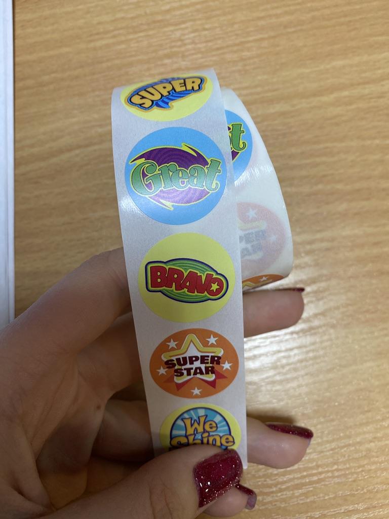 Наклейки дуже малі. Рулончик виглядає, як сантиметр. Самі наклейки не глянцеві, ніби надруковані на принтері.