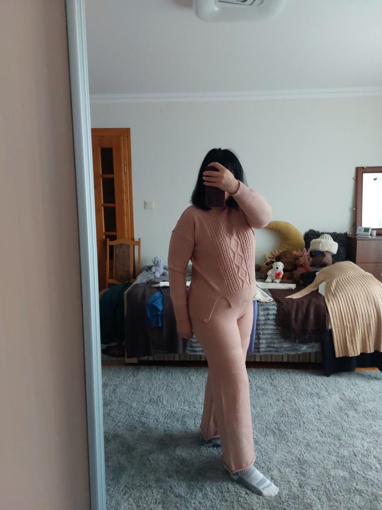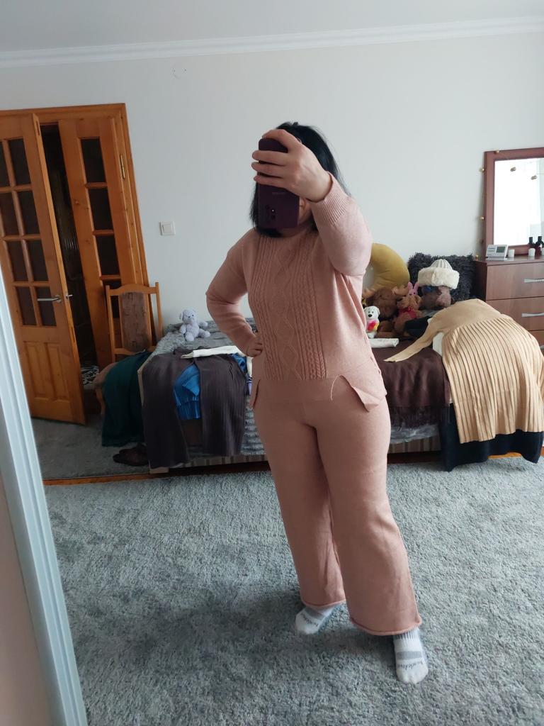 Трикотажний костюм, пильна роза, як мені сподобався і колір і якість і сам костюм. Трикотаж м'ягенький, теплий, середньої плотності, не колиться, добре тягнеться. Один мінус- немає ніяких бірок чи етикетки про розмір чи склад тканини.Повноцінна довжина рукавів і на ріст 162см довжина брюк повна. Мої заміри: Ог 98см От 82см Об 108см. Рекомендую.
