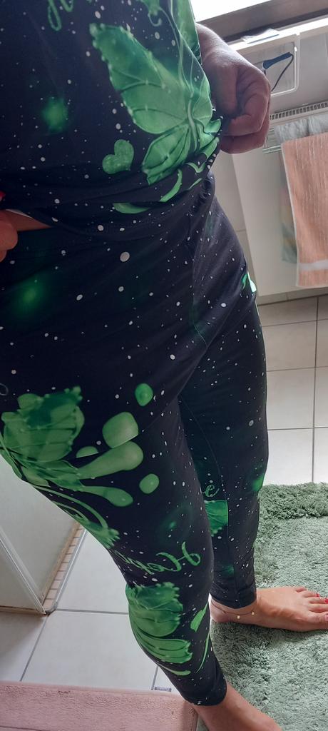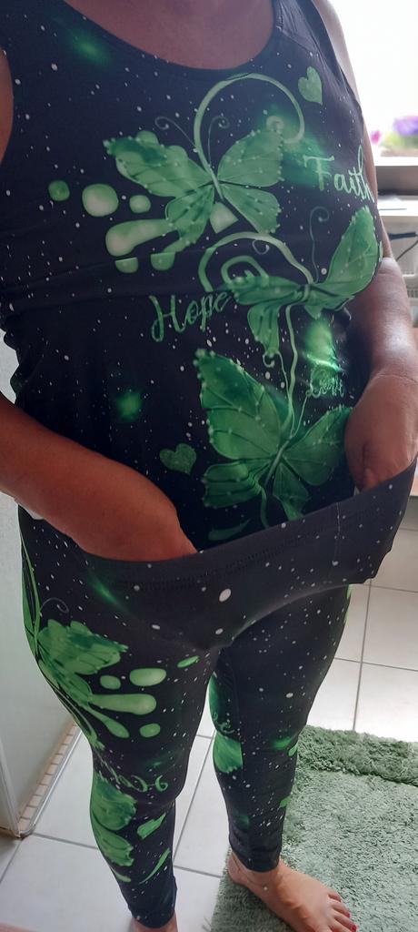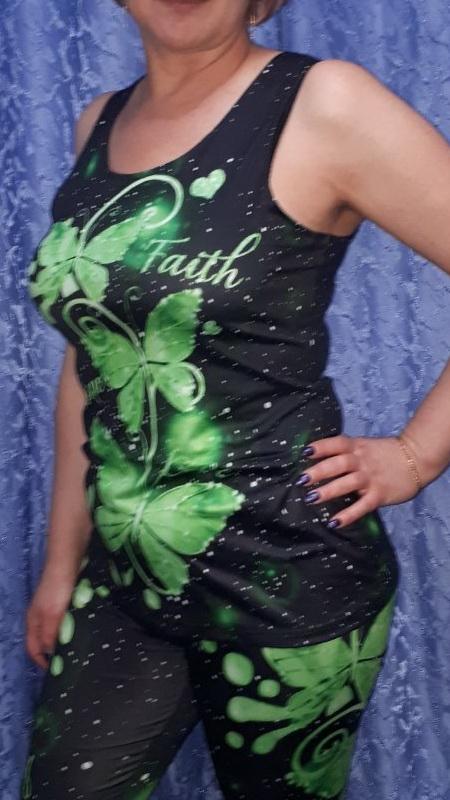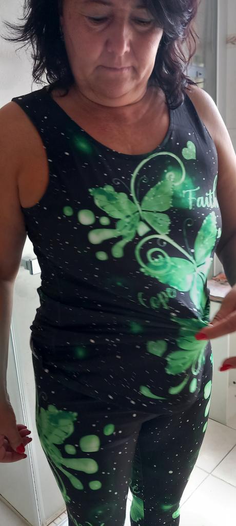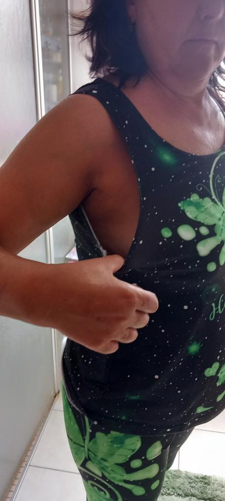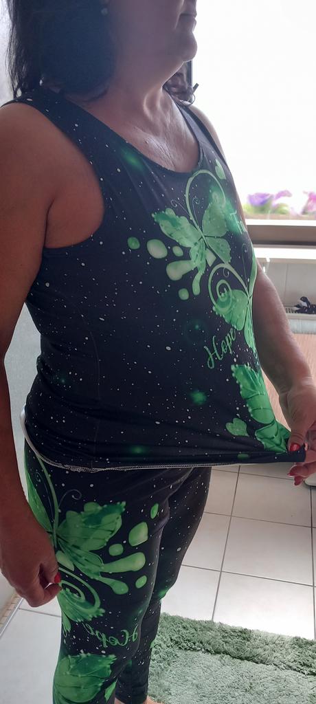Костюмчик гарний, яскравий, синтетика, але приємна до тіла. Не вгадала з розміром. На свій 52-54 завеликий виявився. І ще одне, завеликі вирізи пройми. Повертати не буду. У шию в плечах та завужу штанці