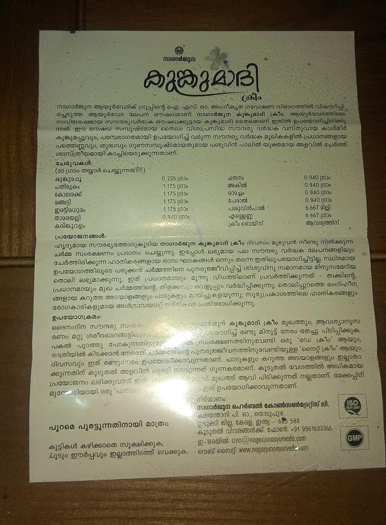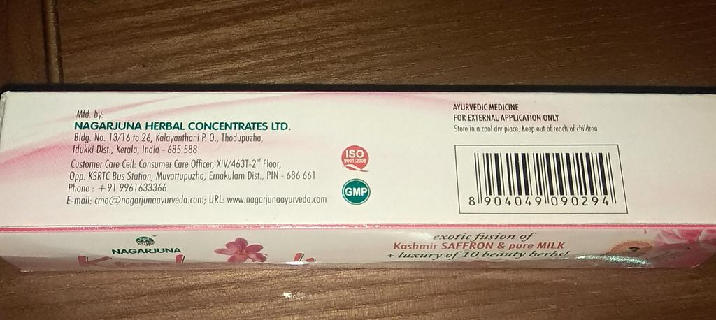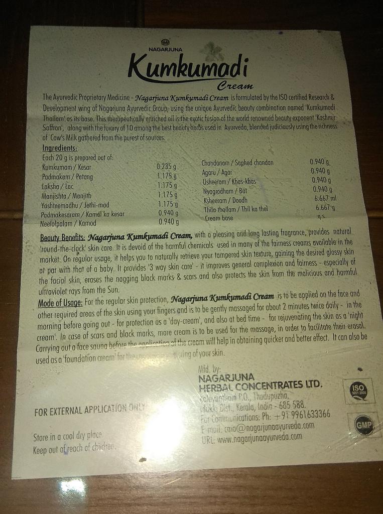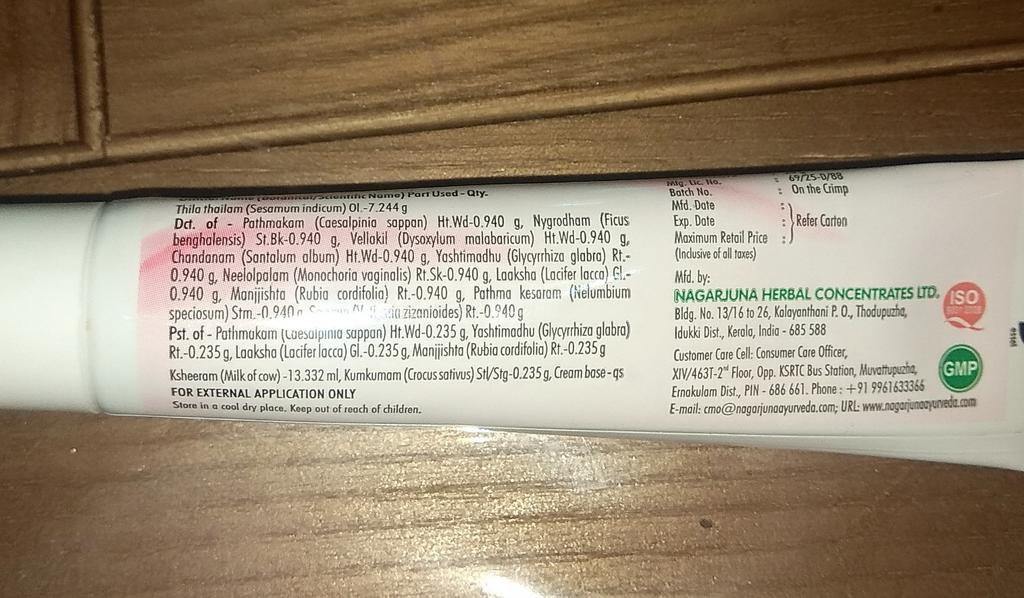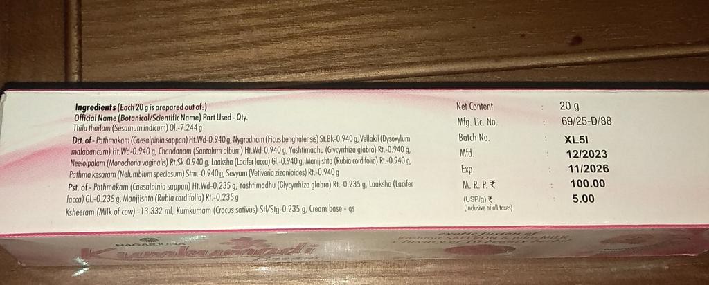 Шафран (Kumkumam) - 0,235 г, Патанга (Podmakom) - 1,175 г, Локша (Laksha) - 1,175 г, Манжишта (Manjishta) - 1,175 г, Солодка (Yashteemadhu) - 1,175 г, Лотос (Podmakesaram) - 1,175 г, Монохорія (Neelolpalam) - 0,940 г, Сандал (Chandanam) – 0,940 г, Червоне дерево (Agaru) - 0,940 г, Ветивер (Usheeram) - 0,940 г, Баньян (Nyagrodham) - 0,940 г, Козяче молоко (Ksheeram) – 6,667 г, Кунжутна олія (Thila thailam) – 6,667 г, Основа для крему (Cream base) - необхідна кількість (Q.S.).